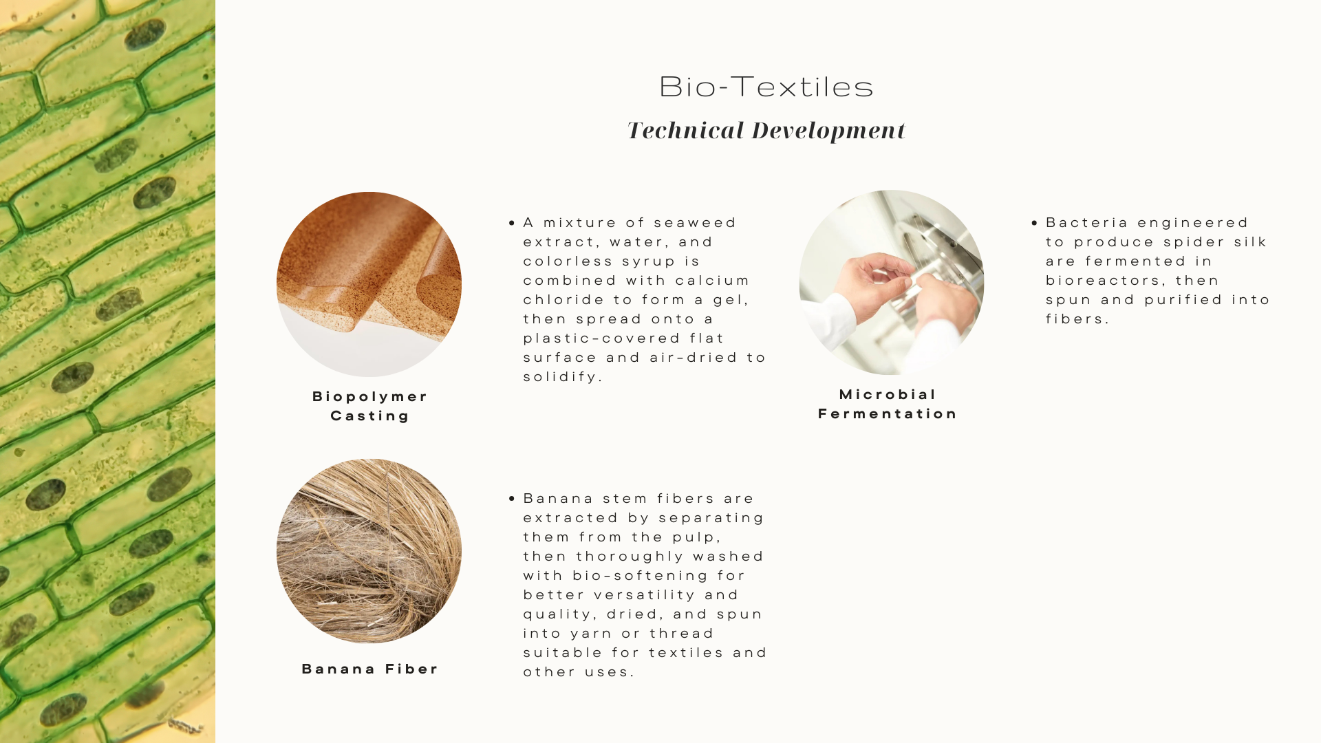 Mycelium (fungal networks), algae,bacteria, agriculture waste, and bio-grown textile structures
